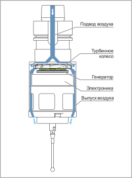 Воздушно-турбинный генератор состоит из воздушной турбины, непосредственно самого генератора и конденсатора с большой емкостью для накопления электроэнергии. Турбина приводится в действие сжатым воздухом, который подается через шпиндель. Этот сжатый воздух может также использоваться для обдува измеряемой заготовки. Таким образом, зарядка конденсатора и обдув заготовки – это одно и то же действие, не требующее дополнительных затрат.